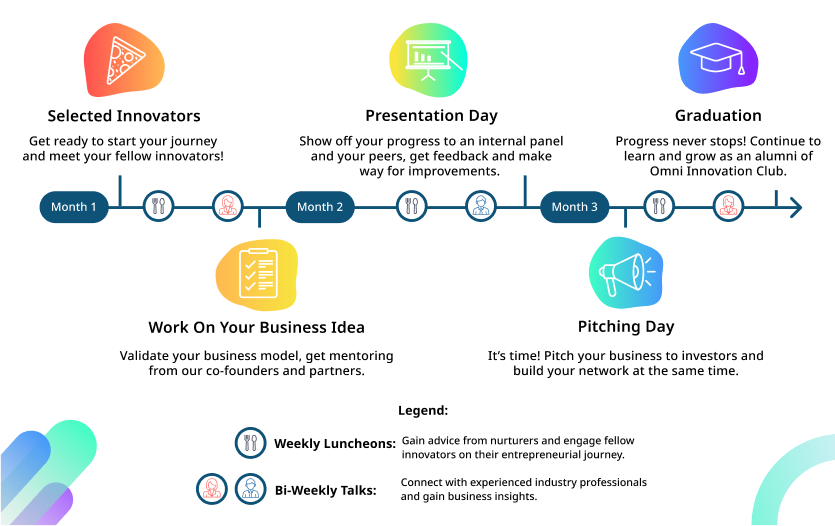 Innovators graduate after 3 months to be part of OMNIIC’s alumni. As part of the alumni network, innovators still get access to office facilities, and will be able to book appointments with our Nurturers for business advice.